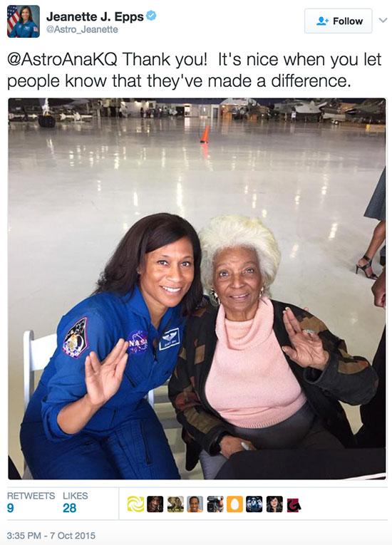 Last year, Epps participated in a NASA video called “NASA: On the Edge of Forever,” which featured her, several other astronauts and also William Shatner and Walter Koenig. Near the very end of it, Epps said, “So every step we take, we're just getting further and further into space and becoming more and more like Star Trek." And Epps, on several occasions, has met Nichelle Nichols, who inspired many woman and people of color to reach for the stars. Check out this tweet she posted in 2015: