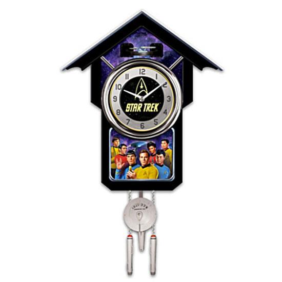 It’s time… for a Star Trek: The Original Series clock, and The Bradford Exchange has just introduced a cool new Cuckoo-style clock that includes a clock body with a striking montage of Kirk, Spock, McCoy, Uhura, Sulu, Chekov, Scotty and the Enterprise, and a sleek, hand-crafted wooden clock face that is protected by glass and is adorned by the Starfleet and Star Trek