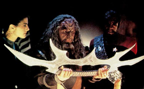 While the Knife of Kirom was later used to clone Kahless, the lost shroud (found somewhere out in the Gamma Quadrant) just has a nicer ring to it. For what is inchoate religion and philosophy if not shrouded in mystery and wonder? Discovering the shroud led Kor and Worf on an adventure, where the sword itself led to a Lord of the Rings-like moment.