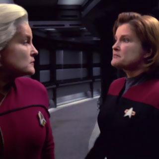 On the other hand, a lecture about repeating mistakes from the older Janeway to the Captain hits a little closer to home than usual. She decries her decision to not use the Caretaker Array seven years earlier as putting the lives of strangers ahead of those of her crew. It's the type of argument that, at any other time (and from any other person), Janeway would simply smack down.