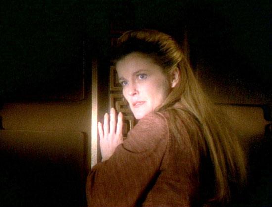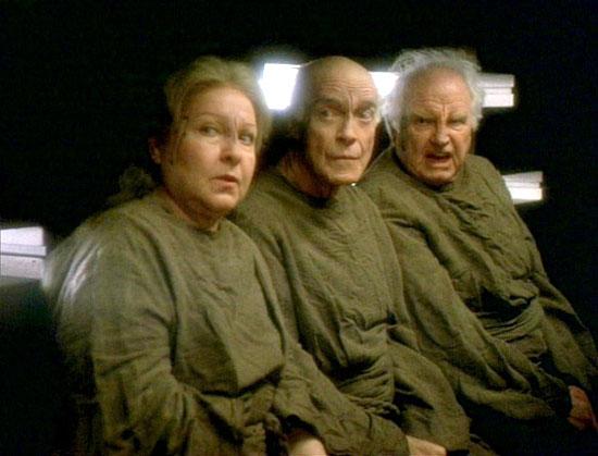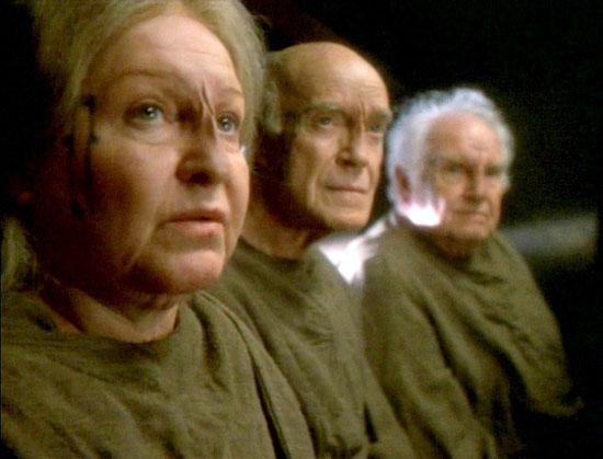 Becky Ann Baker gets far more screen time, though before Janeway's physical challenge she comes upon a waiting room where Estelle Harris is sitting with two old men. The implication is that they are there, simply “waiting” to get called by the Spirits, something that Janeway has no time for with Kes in her condition. Even though Harris tones down her shrill Mrs. Costanza voice, it is a scene that's certainly played for laughs – something of a comic spin on Franz Kafka's Before the Law.(Here's as good of a time as any to point out that Harris' on-screen husband on Seinfeld, Jerry Stiller, is father to the real-life Star Trek fanatic Ben Stiller. Did you know his company is called Red Hour after the episode “Return of the Archons?” Did you catch his character watching the episode “Arena” in the movie Tropic Thunder? You have to wonder if Ben knows that his Dad's longtime pretend wife is part of the larger Star Trek Universe. If anyone is friends with him on Facebook, please ask.)After Janeway thinks she has achieved what she needs to rescue Kes there's a bit of a switch. Kes does not get better. She returns to the planet's surface and has a second conversation with Harris and her two comrades. There are implications that they, themselves, may be the Spirits but, more importantly, the lesson is that only if Janeway has faith will Kes be healed.