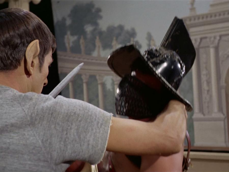 When Spock and Bones are sent to do battle against the TV broadcasting faux-Romans of Planet 892-IV, the Vulcan nerve pinch is there to save our heroes without giving in to the bloodlust of the jerks who are keeping them prisoner. This comes in especially handy because Spock doesn't want to harm Flavius, a runaway slave. As far as the other guy, Achilles, is concerned. . . he is something of a name-calling meanie and is knocked out with a punch. Even if Spock could show emotion I doubt he'd look too guilty.