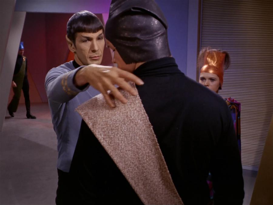 In “A Taste of Armageddon,” as Kirk and Mea fret about how to get past a guard, Spock just effortlessly walks up to him and says “Sir, there is a multi-legged creature crawling on your shoulder.” When the attendant looks aside, in Spock goes with the pinch and he's down for the count. The moment blew my mind as a kid and it still kills me to this day.