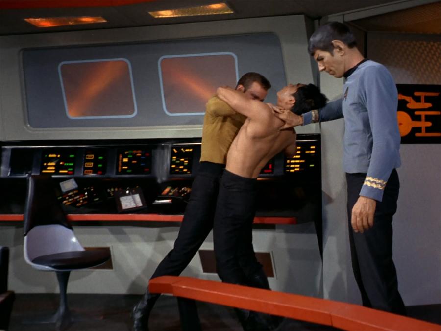 This image really sums up what's so smooth about the Vulcan nerve pinch. There's Sulu, mad on Psi 2000 polywater, grappling with Captain Kirk. Behind both of the furious men stands a cool and collected Vulcan, who needs only to outstretch his hand and – like calmly playing a chord on a piano – silences the bridge of the Enterprise back into order.