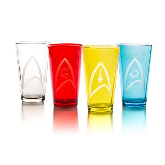 ThinkGeek.com has just unveiled its latest Star Trek-themed product, and it's a Star Trek Uniform Insignia Pint Glass Set. The set includes four colored glasses -- red, blue, gold and clear -- each etched with its respective division insignia (the clear glass has an unadorned Starfleet insignia). As befits a pint glass, each one holds 16 ounces of Romulan Ale, or whatever it is you're drinking.