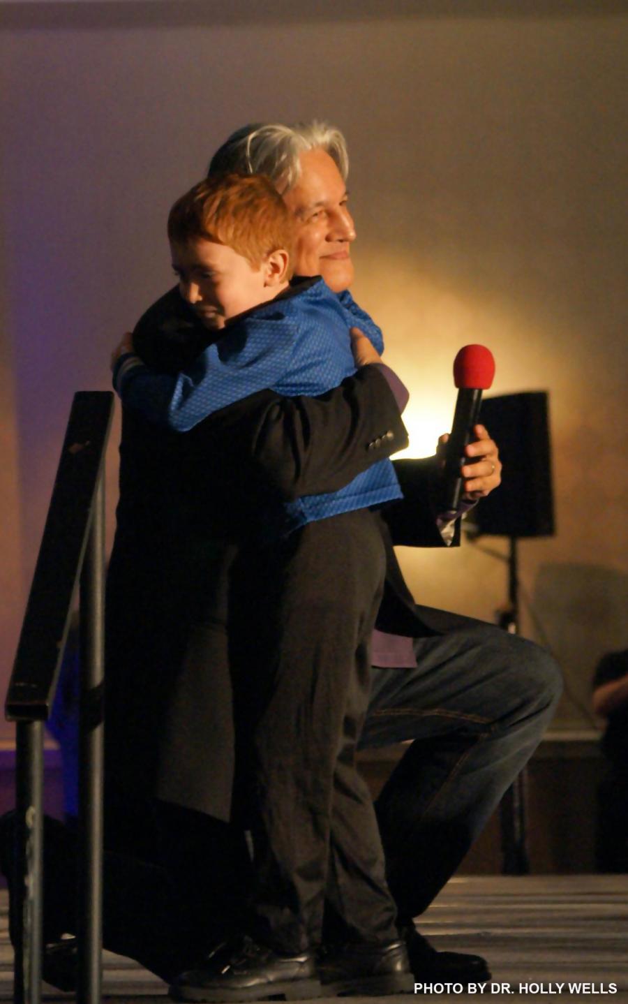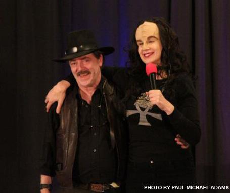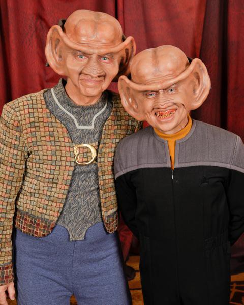 Terry Farrell then made an encore appearance. Among the topics: her early days as a model and actress, and the journey that brought her the happy place she now occupies. A special event then followed. The Grand Nagus, Rom, and his son, Nog, beamed in from the planet Ferenginar and, though dismayed at finding themselves in what was, to them, the past, took the time to interact with the audience. They started with politics (talking about upcoming U.S. President Christie and suggesting that “Rombama” might make a winning name for a Nagus. They then spent some time looking for a sign that could help them find their way back to their own time, but the only sign that appeared was a life-sized image of Quark, who spent the remainder of his time on stage overlooking the other two. A song followed—actually a Ferengi rap—before Max Grodenchik and Aron Eisenberg revealed their hu-manity and took questions from the appreciative crowd. They revealed that they’re about to take their show deep onto the road, doing a multi-city tour of Australia.