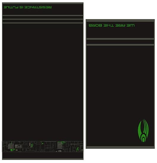 Resistance will be even more futile than usual when it comes to the latest product from Robe Factory... a Star Trek Borg Two-Piece Towel Set. First, there's a black bath towel that measures 31.5" by 59", has an embroidered row of grey and green Borg circuitry, and reads "Resistance is Futile." And then there's a black hand towel, which measures 15 3/4" by 31.5", features a green, emboidered Borg symbol and reads "We Are the Borg."