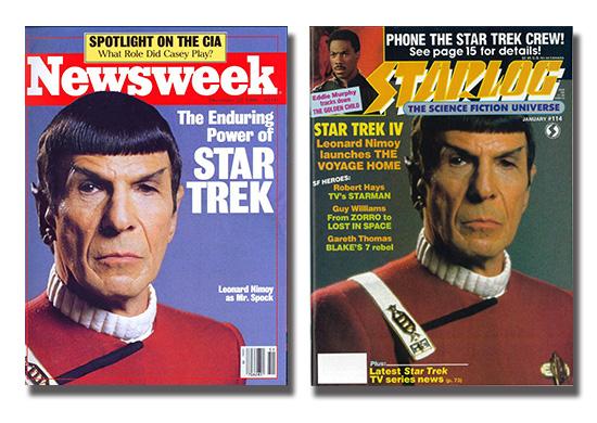 Look, there’s Leonard Nimoy. He’s on Starlog #114’s cover, out the first week of December 1986 for the premiere of Star Trek IV: The Voyage Home (which he directed). That wasn’t unusual. Nimoy appeared many times on Starlog covers (usually with a co-star or two). But here’s why we’re picturing it here: That same Spock image simultaneously graced the cover of Newsweek (then the second most important American magazine after its older rival Time).