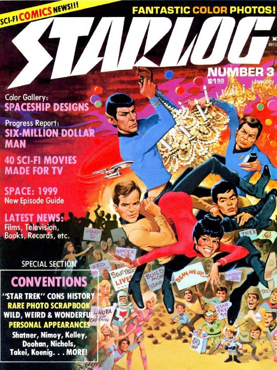 Veteran Mad Magazine artist Jack Rickard painted issue #1’s cover—a two-shot of Kirk and Spock (what, no McCoy?)—in an extremely straight style at odds with Rickard’s (ab)normal, wacky Mad Magazine manner. You can get a taste of his Mad-ness in the Trek-celebs-at-a-con cover he did for Starlog #3. Issue #1: noble, serious heroism. #3: lighthearted, all-out fun. Or more, succinctly, two Jekylls, then lotsa Hydes, all by Rickard.