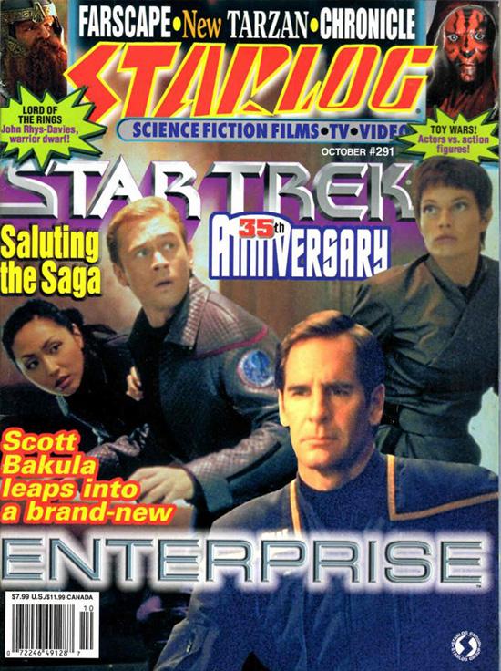 Finally, here’s another regret, one of our lousiest looking covers of all time—and certainly our worst looking Trek Starlog cover ever. Issue #291 (cover-dated October 2001, picturing Scott Bakula and three Enterprise co-stars) went on sale circa September 4 (days before the tragedy of 9/11). This meant it was due at the printer the first week of August. And here’s the problem: UPN (the network launching this new Trek TV show that fall) did not then have a large number of Enterprise images available to the media—eight, maybe 10 in all. I talked to UPN publicists until I was Andorian blue in the face, but I couldn’t persuade them we required more (and better) images. This was it, for now. Nein. Nada. No mas.