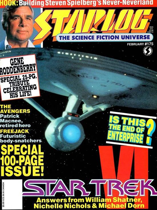 Star Trek creator Gene Roddenberry died October 24, 1991, just as we were finishing Starlog #174. We were able to sneak in a brief notice of his death when that issue went to the printer days later, promising more next time. But that didn’t turn out as planned. Issue #175 included extra pages (at added price) and a special section saluting Roddenberry with appreciations written by George Takei, A.C. Crispin, Peter David, Howard Weinstein, J.M. Dillard, Robert Greenberger, Diane Carey, Brad Ferguson and former Starlog Publisher O’Quinn. There’s a long obituary by Lee Goldberg as well as continued coverage of the just-released Star Trek VI: The Undiscovered Country.