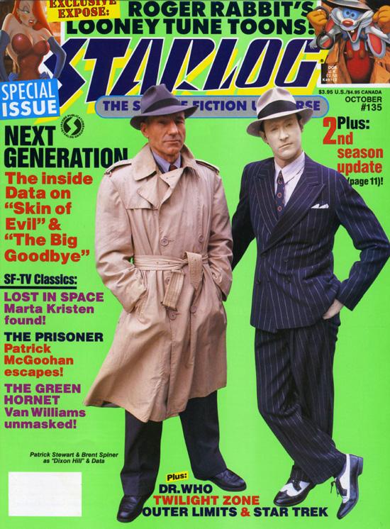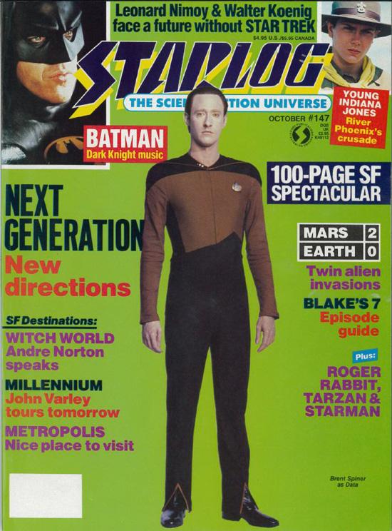 During its initial run, Star Trek: The Next Generation was Starlog’s default cover choice whenever something else fell through. Brief example: 20th Century Fox won’t give us a pre-release photo of Edward Scissorhands for issue #162’s cover out in December 1990? Sayonara, Scissorhands! We have a LeVar Burton interview on hand. Let’s do a Burton as Geordi La Forge cover instead! That’s also true of #135 and #147. I no longer recall what their other cover contenders were, but we went with Patrick Stewart as Dixon Hill and Brent Spiner as Data (#135) and then Spiner solo (#147). And did you notice the background color? Yes, green! That’s intentional, a naked, cold-blooded attempt to duplicate #130’s sales: Next Gen actors, full-body shots, green backgrounds.