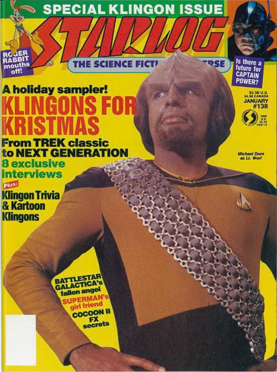 Two years later, there’s Starlog #138. In this case, there was no movie (Trek IV) or TV show premiere (Enterprise, #291) to tie in to, no big interview to be showcased (#130) and no default-to-Trek substitute covers (#162, #135, #147). This is a "concept cover," some intriguing idea brainstormed for the magazine’s exterior and only afterwards are its contents found (i.e. jerry-rigged by editors) to support that imaginative cover notion. Issue #138 would be on sale December 1988, so why not "Klingons for Kristmas"?