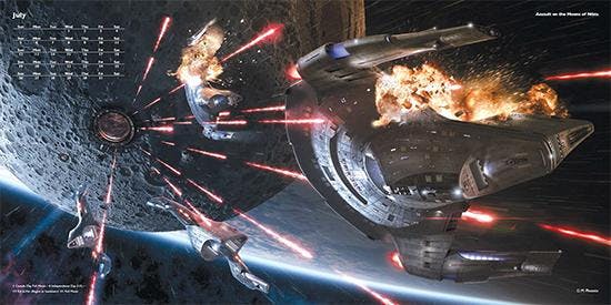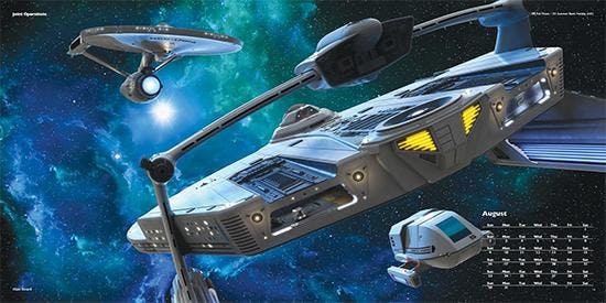 The 2015 Star Trek Ships of the Line calendar is available now and it’s a real beauty. The calendar features 13 gorgeous full-color renderings of Federation ships, including the Enterprise; moments of Star Trek history, plus a full-spread centerfold image. It measures 12x12 inches and opens panoramically, like a book, for a fuller experience with the artwork. And each work is an original executed for the calendar by a fan-favorite artist, including for 2015, Jenny De Salle and Ali Ries, Tobias Richter of LightWorks, Andrew Probert, John Eaves, Doug Drexler, Alain Rivard, Douglas E Graves, DM Phoenix, Dan Uyeno, Gabriel Koerner, and Michael Wiley.