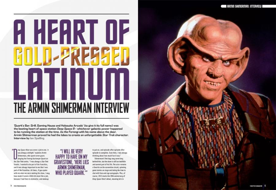 Star Trek – from TOS to TNG -- had been happily exploring all corners of the galaxy for just over a quarter of a century, seeking out new life and new civilizations, when Deep Space Nine drifted onto terrestrial scanners in 1993. To commemorate Deep Space Nine’s 20th anniversary, Star Trek Magazine #43, which will go on sale January 22, has a brand-new interview with Armin Shimerman. Here is an exclusive excerpt: Quark’s Bar, Grill, Gaming House and Holosuite Arcade (to give it its full name) was the beating heart of space station Deep Space 9 – whichever galactic power happened to be running the station at the time. As the Ferengi with his name above the door, Armin Shimerman proved he had the lobes to create an unforgettable Star Trek character.“Deep Space Nine was never a job to me. It was always a delight.” explains Armin Shimerman, who spent seven years playing the Ferengi barkeeper Quark on the Star Trek series. “I was always a Star Trek fanatic. I wanted to be part of the franchise, and it was always important to me that I was part of the franchise. At times, if you spoke with me when we were making the show, I may have made it seem a little bit more like a job, because I had lines to memorize, and makeup to put on, and episode after episode after episode to complete. Even then, I was always thinking about how much fun it was.” Shimerman’s Trek days may seem long behind him, but the show is still an indelible and current part of his life. The actor remains a favorite on the convention circuit, spinning great stories on stage and taking the time to chat with fans and sign autographs. Plus, of course, 2013 marks the 20th anniversary of Deep Space Nine’s debut, meaning he’s in demand for even more conventions, appearances and interviews than ever. Shimerman doesn’t turn his back on fans, or such opportunities. He’ll often attend conventions in the company of his wife, actress Kitty Swink, who twice appeared on Deep Space Nine, though never alongside him. Their table at conventions usually ends up in a row next to those of his Deep Space Nine supporting actor friends, Max Grodenchik, Aron Eisenberg, and Chase Masterson, who, respectively, played Rom, Nog, and Leeta. His current projects include writing a new novel, and taking on various roles – including actor, board member, associate artistic director, show director, and goodwill ambassador – for The Antaeus Company, a not-for-profit theater company in Los Angeles.