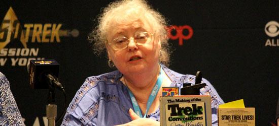 One panel that most fans had never, ever seen the likes of before was The First Convention and How It Helped Resurrect Star Trek. That first convention, planned by avid fans and done on a shoestring budget, took place in 1972 in Manhattan and set the stage for all the sci-fi and Trek cons that followed, including Mission New York. Eight hundred fans were expected... 3,000 showed up. Committee members/organizers on the Mission New York dais included Stuart Hellinger, Elyse Rosenstein, Joyce Yasner, Devra Langsam and Linda Deneroff. They were full of anecdotes about the landmark con and the ones they put on through 1976, and also took time to pay tribute to the late Joan Winston, their friend and co-organizer.