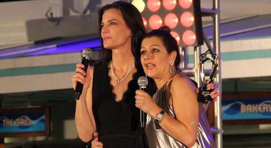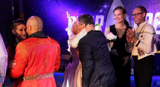 As the sun set outside, Terry Farrell led the Renewal of Vows Ceremony in 13 Forward. There, 80+ couples renewed their vows tonight with Terry, who’s an ordained minister, and Dane Butcher. The ceremony was written specially for the Star Trek Cruise. Ten couples exchanged vows at a time.