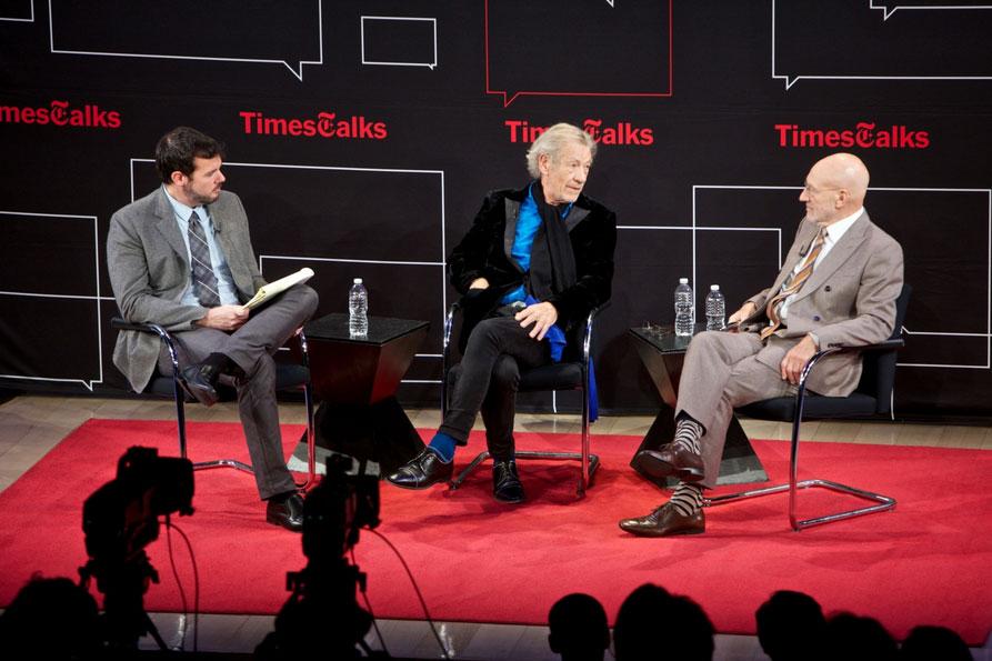Sir Patrick Stewart and Sir Ian McKellen, the septuagenerian bro-mancers of Shakespeare and science fiction, stepped away from taking TwitPics for a few minutes to appear on Monday at the classy Times Talks atrium in New York City. Amid red velvet seats, ushers in conservative dress and a posh audience that, as my Uncle Ira would say "smelled from money," the pair fielded questions from New York Times theater editor Patrick Healey.