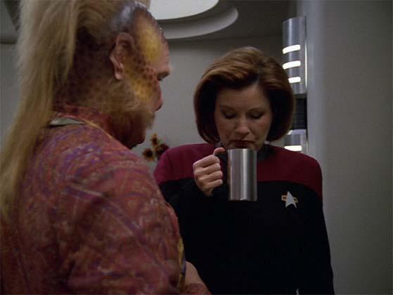 Come on, you cracked up when Janeway practically threatens Neelix to fetch her coffee, and not just coffee, but coffee black? And, when she sips it, her reaction is priceless.