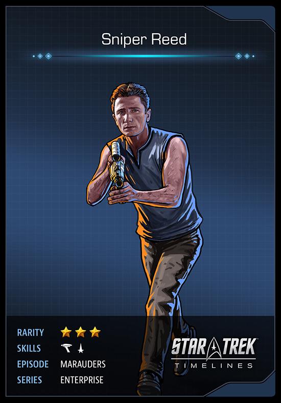 Sniper ReedSeries: EnterpriseEpisode: "Marauders"Skills: Security, CommandMaximum Rarity: Three Stars