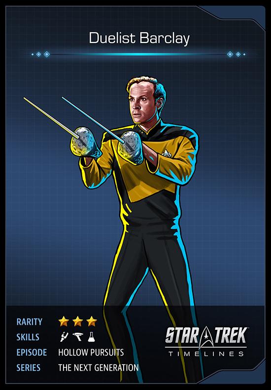Duelist BarclaySeries: The Next GenerationEpisode: "Hollow Pursuits"Skills: Engineering, Security, ScienceMaximum Rarity: Three Stars