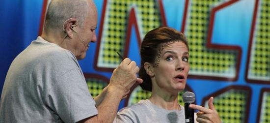 Dax 539. It was an event to behold and to remember. This past Saturday, Terry Farrell stepped on to the big stage at Creation Entertainment’s Official Star Trek Convention in Las Vegas. She sported black sweatpants, a gray “Dax 539” t-shirt and no makeup. Enter the Oscar-winning makeup guru Michael Westmore, who’d applied Farrell’s Jadzia Dax Trill spots 538 times during her six years on Star Trek: Deep Space Nine. And now Westmore did so one more time, with Farrell and Westmore chatting amiably with each and the audience as Westmore wove his magic. Westmore finished and Farrell excused herself, leaving Westmore to interact with the audience for a little while.
