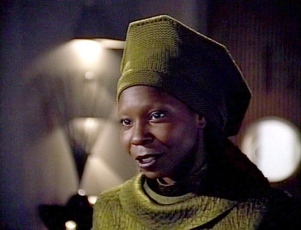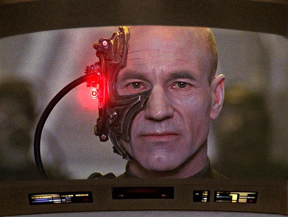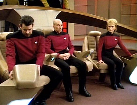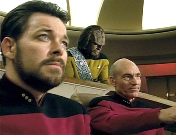 -- I never noticed it before, but you can hear a few notes of the classic TOS score when the away team beams over to the Cube and sees Picard as Locutus for the first time. And here we thought Michael Giacchino was a genius for his Star Trek (2009) score!-- They cut the “To Be Continued. . . !” This special “feature-length” presentation of “The Best of Both Worlds” plays through like a movie. As such, the gap we experienced in summer 1990 doesn't exist. It still works, but for those of us waiting for a freak-out moment as the orchestra swelled “dun-dun-dun! Dun-dun-dun! Dun-dun-dun! Dunnnnnnnnn!” over a black screen – well, we didn't get it! Eh, you can't have everything. -- When Whoopi Goldberg enters a scene she gets a round of applause. When her scene ends, she gets a round of applause. When she speaks, she gets applause. It's amazing you could ever hear anyone speak in Ten-Forward with all that applause.