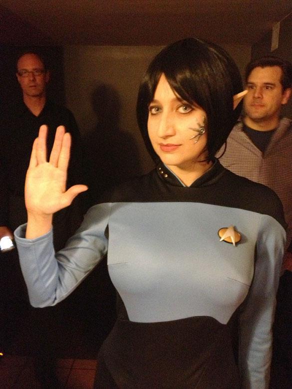 Before the lights dimmed, in addition to the usual pre-show Trek trivia on the screen, I did my usual snooping around the theater looking for folks in costume. There were a few, but none better than the somewhat obscure character Selar with some slight Borg alterations. Hey, it could happen!