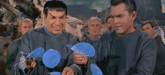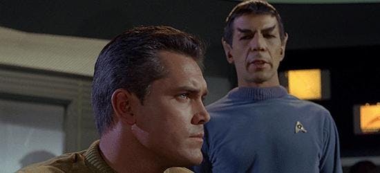 -- Leonard Nimoy played Spock… with just a touch of emotion (he smiles broadly in one scene). Nimoy had guest starred previously on Roddenberry’s series, The Lieutenant. He also, interestingly, shared the screen briefly with William Shatner in “The Project Strigas Affair,” an episode of The Man from U.N.C.L.E. that aired on November 24, 1964.-- Majel Barrett played Number One, the ship’s second in command. The story goes that NBC, when they OK-ed a second pilot, compelled Roddenberry to pick either the pointy-eared alien or the female first officer; he could not have both. Barrett, who went on to marry Roddenberry, later portrayed Nurse Chapel and provided the voice of most of the computer systems heard throughout the Trek shows and movies. Barrett-Roddenberry passed away on December 18, 2008, not long after voicing the Enterprise computer one last time for Star Trek (2009).