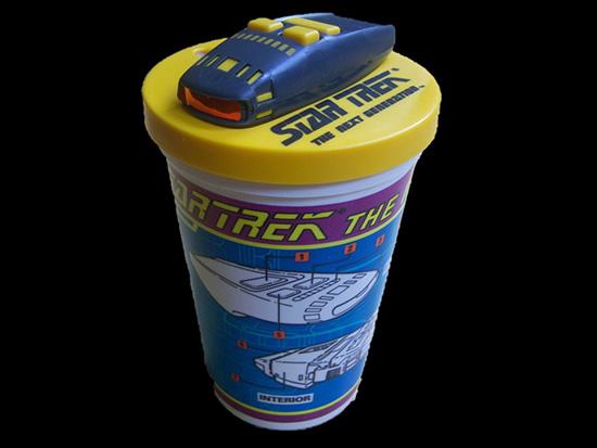 Perhaps one of the most interactive of the plastic cups campaigns was the eight offered by Pizza Hut during 1993 and 1994, four each from the TOS and TNG eras. On top of each cup was a small plastic toy replica of the original U.S.S Enterprise, the TOS era Klingon cruiser and Romulan Bird of Prey, and the classic communicator, along with the U.S.S. Enterprise 1701-D, a TNG era communicator, tricorder and Type I phaser.