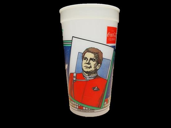 In 1986, Stop-N-Go Foods, Inc. offered fans visiting their stores four different plastic cups with original art from Star Trek IV: The Voyage Home. Making these cups extra special was their futuristic glow-in-dark capability.