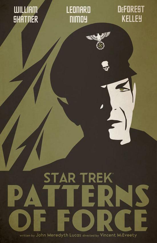 Ortiz: It is a bit stark, but it started out a lot busier and almost cartoon-like. My original design had the Enterprise zooming down upon a planet with a large swastika on it, similar to WPA posters during WWII. My design was interesting, but I felt it lacked substance. I decided instead to go with an image of Spock in a Nazi uniform. The result has a bit of Yin and Yang look to it. I liked the subtleness of the final piece.