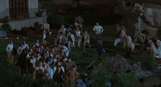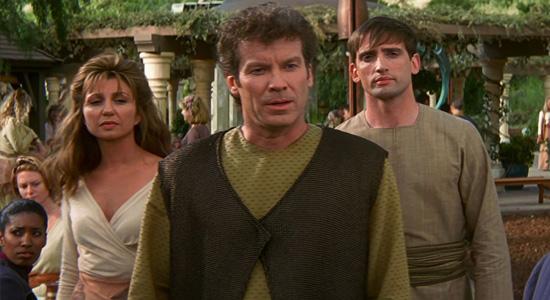 Ultimately, the idea of using a Ba’ku version of the Titanic musicians was never fully realized. The film instead focuses on a variety of other kinds of Ba’ku artistic endeavors, from blacksmithing to break-making. The evacuation scene does use big chimes/gongs to sound the alarm, as Piller suggests in his January 20th memo, but that is mostly the extent of the musical elements of the Ba’ku that are given primary focus. (As an aside, that doesn’t limit the power of the Ba’ku evacuation scene as filmed and edited because Jerry Goldsmith’s music, Herman Zimmerman’s village designs, Jonathan Frakes’ direction, the special effects, stunts and acting all combined to create a visually dynamic, original and exciting sequence).