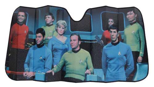 If your car is your personal starship Enterprise, then PlastiColor wants to help you accessorize it in Trek style. They've just introduced a variety of Trek-inspired automotive accessories, available later this month via Entertainment Earth; follow the links below to pre-order. First up is a foldable Star Trek sunscreen that features a wide image of the Original Series crew surrounding Captain Kirk. The product, which measures 58 inches wide by 27.5 inches tall, costs $15.99. Visit www.entertainmentearth.com