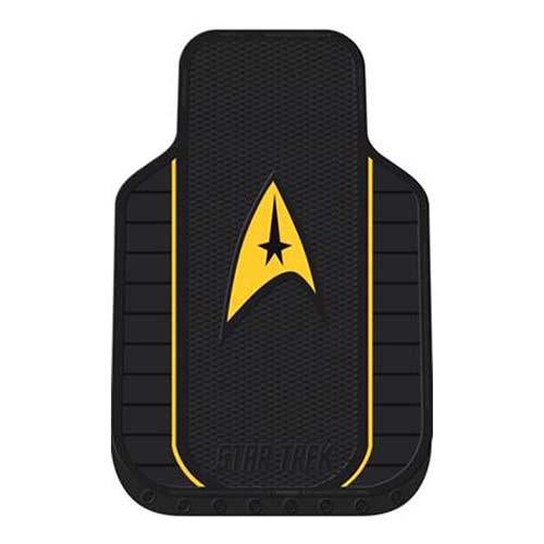 earth.com to pre-oder.Next, there's a pair of air fresheners, one with the Vulcan greeting, the other with the Starfleet delta symbol. Each package costs $2.99 and features two fresheners. Visit www.entertainmentearth.com to pre-order the Starfleet delta symbol air fresheners and HERE for the Vulcan greeting air fresheners.Moving on, there floor mats and a utility mat. Both universal-fit, rubber mats feature, you guessed it, the Starfleet delta, with the floor mats coming as a pair. The floor mats cost $42.99; visit www.entertainmentearth.com to pre-order. The utility mat, which measures approximately 17 inches by 14 inches, costs $14.99, visit www.entertainmentearth.com to pre-order. Who says the Enterprise doesn't have seatbelts? You can sure will with an easy-to-install Star Trek delta symbol shoulder pad. It costs $7.99. Go to www.entertainmentearth.com to pre-order.