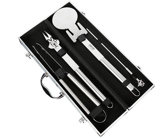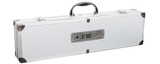 The set includes seven (7) custom stainless steel BBQ tools, including a USS Enterprise NCC-1701-D Spatula, TNG Delta Tongs, a Cardassian Fork, and four TNG Delta Skewers. And it all comes in an aluminum case with custom logo plate. The Star Trek The Next Generation BBQ Set is available now. It costs $69.95. Go to www.shop.startrek.com to purchase.