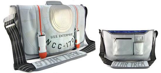 Let's give most inventive Star Trek product of the week honors to Crowded Coop for its new Star Trek Enterprise NCC-1701 Messenger Bag. The bag features construction and decoration inspired by the TOSEnterprise, with the front flap replicating the hull of the NCC-1701 and the custom buckle hardware inspired by the auxiliary engine. Under-flap pockets, zipper storage and an inner padded laptop pocket are among other highlights. Measuring 18-inches long x 12-inches tall x 5 1/2-inches wide, Star Trek Enterprise NCC-1701 Messenger Bag is in stock now.