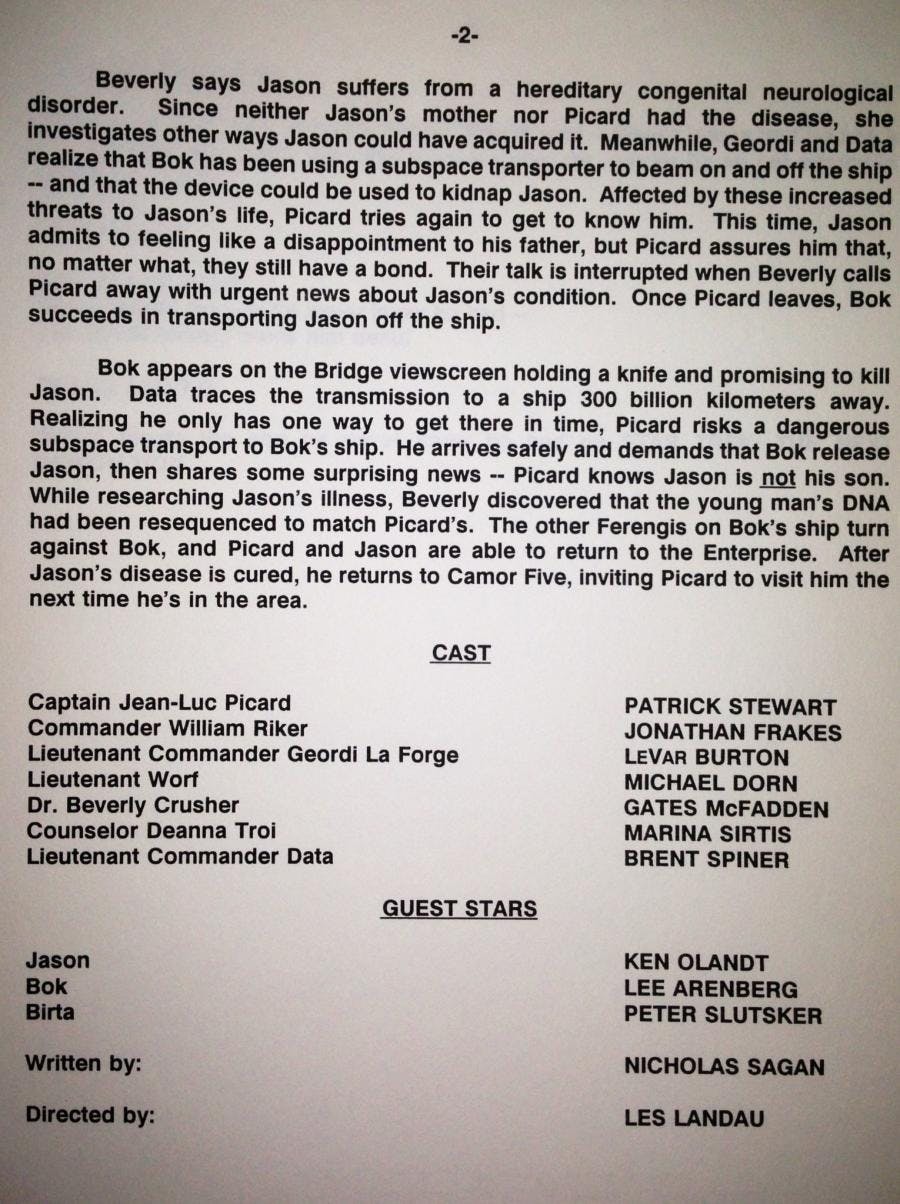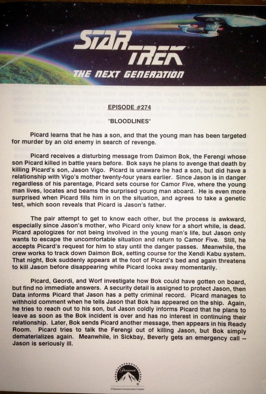 BG&H also, each week, snail-mailed journalists and editors an oversized envelope that included a full synopsis of a TNG episode, along with an 8x10 black and white photo. The photo was usually split, with two or sometimes three images representing the episode. The full synopses started with a one-line synopsis and then went into full detail, covering the better part of two pages each time. Journalists relied on these synopses for such vital information as the names and correct spellings of planets, ships, guest characters, etc. Note how the “Bloodlines” synopsis references Daimon Bok, Jason Vigo, the Xendi Kabu system and Camor Five. The synopses – which were signed off on by the show’s executive producers -- also always included the names and spellings of the core TNG cast, plus guest stars, as well as writer and director credits. (See below)