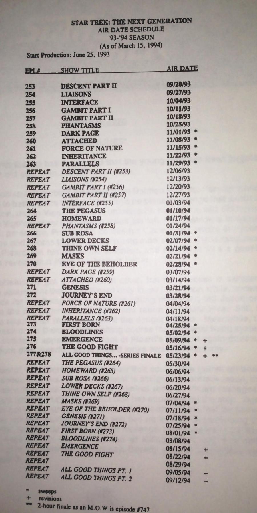 Today, we’re pleased to introduce a new regular feature on StarTrek.com. At least once a month we’ll dip into what we’re calling the Trek Archive, mountains of stuff that reveal how the various Star Trek television shows and films were promoted, including press releases, newsletters, faxes and press kits. There will be other goodies, too, among them call sheets used during production, design sketches and promo items.Tomorrow, for example, marks the 20th anniversary of the Star Trek: The Next Generation episode “Bloodlines.” It debuted on May 2, 1994. During TNG’s run, Paramount Pictures relied on the public relations firm Bender Goldman & Helper to handle the show's publicity. That encompassed everything from arranging interviews for the talent and securing entertainment show segments and cover stories in the major magazines to handling set visits, arranging/overseeing photo shoots, creating press kits and much, much more. The Internet was still in its infancy then, and so BG&H routinely faxed editors and freelance journalists at newspapers and magazines a schedule of what episode would air and when. (See below)