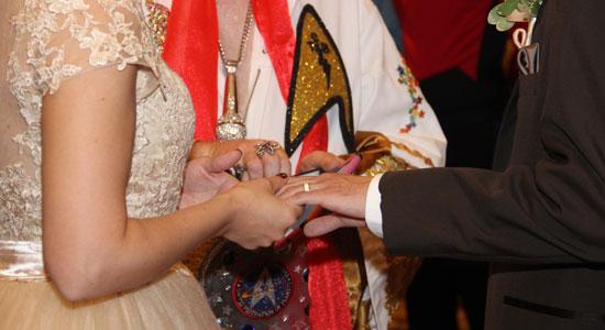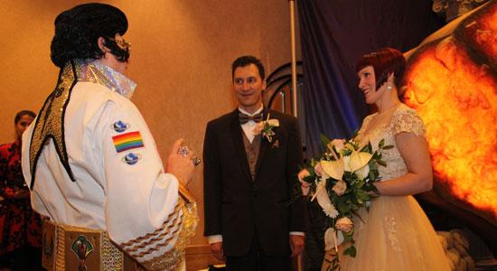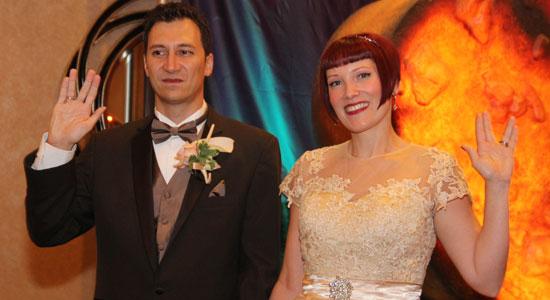 So, you’re in love. You love Star Trek. And you love Elvis Presley. What do you do? Well, if your Astrid Dees and Chris Miller, you get married at Star Trek Las Vegas, in a ceremony officiated by Star Trek Elvis. The happy couple tied the knot on August 4, exchanging their vows in front of the Guardian of Forever display at the Rio Suites Hotel. And, we’re not kidding about Star Trek Elvis. The Elvis impersonator, resplendent in a white jumpsuit bling-ed out Trek-style, is an ordained minister with the Universal Life Church.]