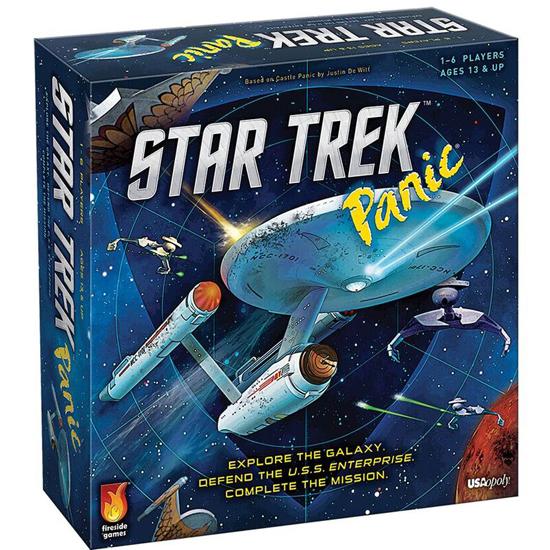Panic Board GameUSAopoly, in partnership with Fireside Games, announces Star Trek Panic, a new board game that merges the classic tower defense style play of the Panic series with the most iconic elements of the original Star Trek universe. In Star Trek Panic, players join the crew of the U.S.S. Enterprise on a voyage to defend the ship from enemy attacks and carry out five vital galactic missions.This cooperative light strategy game introduces new, never before seen, Panic game mechanics, including Mission Cards, which feature unique challenges based on TOS, as well as Character Cards, so players can assume the roles of Kirk, Spock and more. Star Trek Panic comes complete with a maneuverable U.S.S. Enterprise model ship, Shields, Damage and Destroyed Indicators, Mission Cards, Character Cards, Enterprise Cards, etc. Star Trek Panic will be available May 2016 at game & toy stores and specialty retailers in the United States and Canada. It will be priced at $39.95.