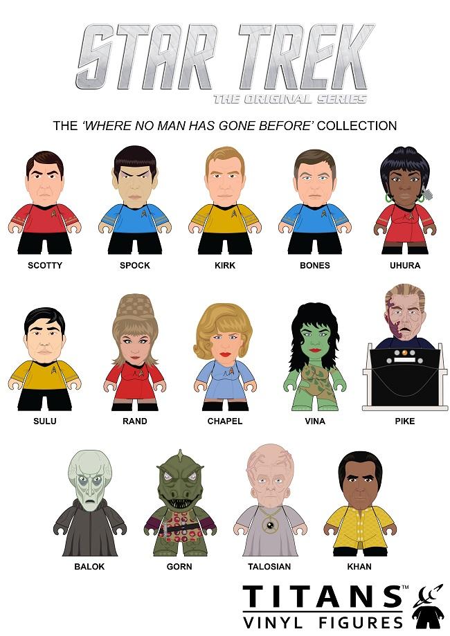Titan Entertainment has lifted the curtain on Star Trek Season One TITANS, specifically the "Where No Man Has Gone Before" Collection. Part of Titan’s ongoing mission to produce the finest collectible Star Trek vinyl figures, the TITANS - The "Where No Man Has Gone Before" Collection features characters from the first season of TOS, led by the trio of Captain James T Kirk, Spock and Doctor Leonard 'Bones' McCoy. Actually, all of the iconic bridge crew from season one of TOS are represented in the debut blind-boxed TITANS wave, including Uhura, Sulu, Scotty, Nurse Chapel and Yeoman Rand, alongside such classic Season One nemeses as the Balok, the Talosian Keeper, the Gorn and Khan Noonien Singh. Each figure is 3” blind-boxed, and certain pieces come with a character-specific accessory. Fans should be on the lookout for two hidden chase figures they can hunt and collect.
