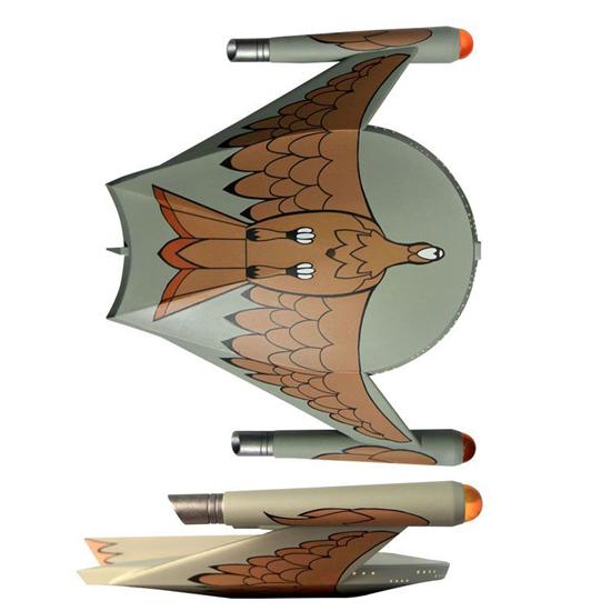 Diamond Select ToysDST, for Star Trek’s 50th anniversary, going back where it all began, to TOS, with a brand-new ship in the Starship Legends line. The Romulan Bird of Prey, with its low profile and distinctive underbelly markings, is as menacing and mysterious as the Romulan Empire it served. Measuring 9 inches long with a 12-inch wingspan, the Bird of Prey features dialogue and sound effects taken straight from TOS, as well as lights that are activated with the sounds, and can also be turned on permanently. The ship is packaged in a 50th anniversary-branded, full-color window box, with a Try-Me feature that allows buyers to try out the lights and sounds. Designed by Art Asylum, it costs $60.00.