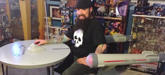 Each week on the web series Super-Fan Builds, Tim Baker leads a team of prop designers in erecting mind-blowing tributes to beloved shows, movies and videogames. And they're built especially for super-fans... with those super-fans nominated by friends or loved ones. We're sure you can figure out where this is boldly going.In the most recent episode, in a segment entitled "Star Trek Computer Table & Office Chair," Baker and his team at Tim Baker Creations crafted an Enterprise home office for Star Trek mega-fan Jake Geiger. It was Geiger's girfriend, Christina Haberkern, who nominated him for the honor. The challenge here was to create something special for a Trek fan who seems to have every conceivable Trek collectible. Heck, this guy -- who calls himself a "slight hoarder" -- even has a Spock tattoo that Leonard Nimoy autographed for him, with that autographed then turned into a tattoo as well.