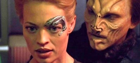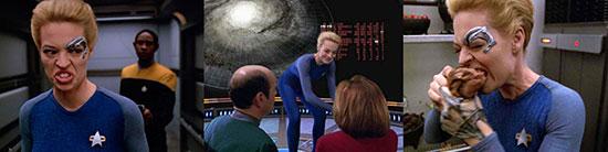 Let’s not forget Seven of Nine’s nervous breakdown into multiple personalities in another Voyager episode, “Infinite Regress,” shifting between all the species she'd helped to assimilate, from Klingon to Ferengi to the Vulcan High Command’s Subaltern Lorot, even a little girl named Mary. Leaving aside the obvious question about how much confusion and guilt played into her disorder, which personality is truly her own? Who is she? Where does she belong? Questions like these plagued Seven throughout her years aboard Voyager.