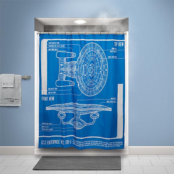 If you've ever wanted to study the fine details of the U.S.S. Enterprise-D while showering -- yes, while showering -- now's your chance. ThinkGeek has just unveiled a Star Trek: The Next GenerationBlueprint Shower Curtain, a polyester shower curtain with a blue and white schematic view -- top and front -- of the Enterprise-D.