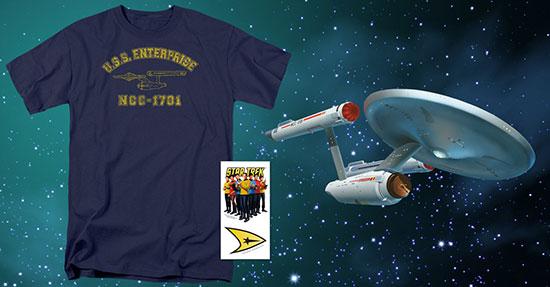 Beam up the dark blue Star Trek USS Enterprise T-Shirt, which features a side view of the Enterprise between the words U.S.S. Enterprise and registry number NCC-1701. It comes with TOS cast and Starfleet delta shield stickers.