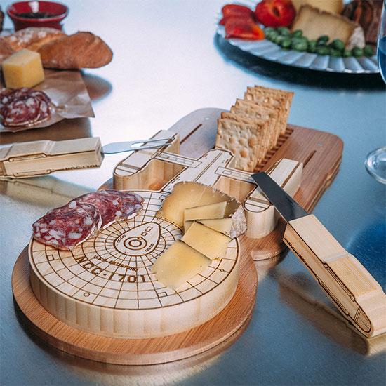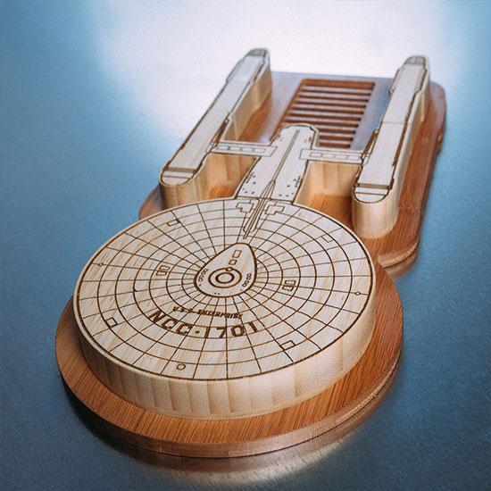 The Enterprise has always been a versatile ship, but now, in the form of a Star Trek Cutting Board, the NCC-1701 is ready to serve up hors-d’oeuvres. Newly available in the Star Trek Shop here at StarTrek.com and priced at $59.95, the Star Trek Cutting Board doubles as a cheese plate and a sleek cutting board. The design, as Spock might say, is fascinating -- and inspired. A cheese knife and cheese fork seamlessly tuck away into the board as the engines, while the base and utensil handles have small magnets to help keep them in place when moving around. The base also features cracker slots to keep crackers in place, and the ship is laser-etched into the top with accurate details. To get the most use out of the product, simply flip over the vessel for cheese and crackers and use the base as a full sized cutting board.