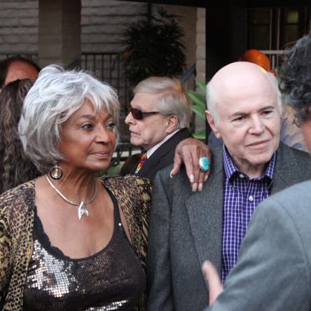 Cut to a couple of hours later. It's 6:30, time for a cocktail party outdoors at the Beverly Garland Hotel. Fans are gathering, many of the men in suits and ties, many of the ladies in dresses. It's the same with the actors and the special guests who've come to join in the fun. Nichelle Nichols arrives, looking glam and glittery. Harlan Ellison is holding court in the shade. Tracy Scoggins is there, as are Jamie Farr, Courtney Peldon John Carrigan, Chase Masterson, Jerry Doyle, Dorothy Fontana and more. Walter Koenig is there with his wife, Judy. Koenig's daughter Danielle taps her dad on the shoulder. He sees her and there's a twinkle in his eye. "Hi, darling," he says, wrapping her in a hug. He and Nichols embrace. StarTrek.com catches a moment with Koenig. "It's... neat," he says of the proceedings, a broad smile on his face. "I'm really enjoying myself."