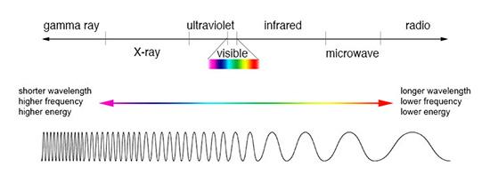 The color of an object emitting energy depends on the temperature of that object. You may have observed this phenomenon with a stove in your kitchen, or with a Bunsen burner in the lab. If you turn it up low, the flame is deep red; if you turn it up high it is blue-white. It turns out that there is a relationship between the color of radiation and the amount of energy it carries. Light is electromagnetic radiation; it has a range of wavelengths and frequencies. Red light has a longer wavelength and lower frequency than blue light, which means it carries less energy than blue light, so therefore it is cooler than blue light. You may recall seeing rainbows in the sky, the colors always having a particular order, red-orange-yellow-green-blue. The colors are sorted by the amount of energy they carry, with red having the least and blue having the most. The light is refracted by water droplets in the atmosphere, with high energy blue light being refracted the most, and low energy red light being refracted the least. But the spectrum of light actually extends far beyond the colors we can see. In the image below you can see how the various types of light are related by wavelength, frequency and energy.